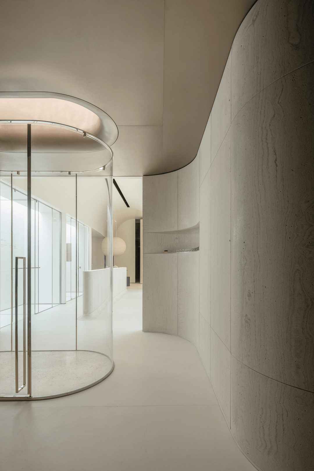 外立面以退為進,轉角處全以弧形處理,呼應內部造型,琢磨細節所形成的空間形態,帶來細膩而自在的空間氣質。