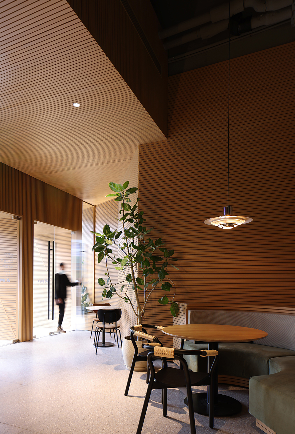 空間材質(zhì)以溫和的木質(zhì)搭配綠植為主,讓人與物的關(guān)系從城市的工業(yè)屬性轉(zhuǎn)化為自然屬性,為就餐空間創(chuàng)造一個(gè)具有場(chǎng)景性的綠洲環(huán)境。空間氣質(zhì)上盡可能避免給人一種“效率化”感受,顏色、材料選擇盡可能地體現(xiàn)“親生物性”,而空間中留有原建筑的跡象,讓二者之間并沒(méi)有形成強(qiáng)烈的分隔感,使其相互保持著一種對(duì)立與統(tǒng)一。
