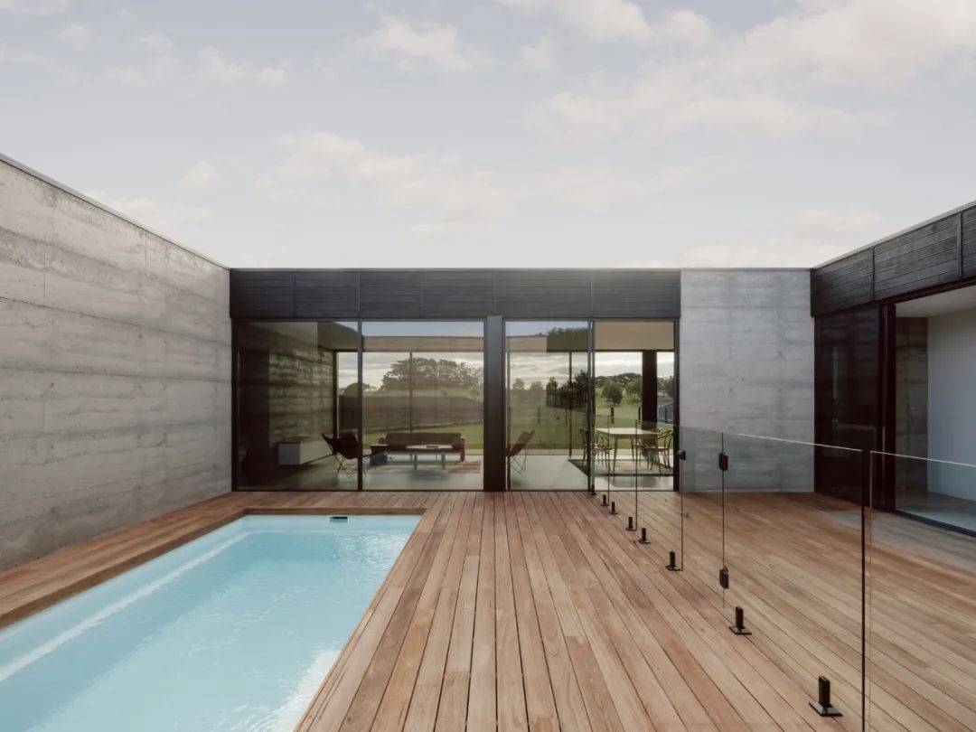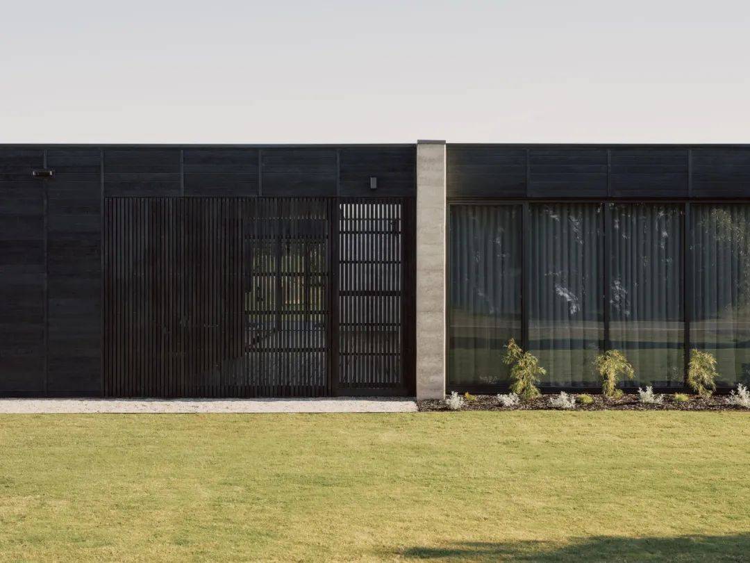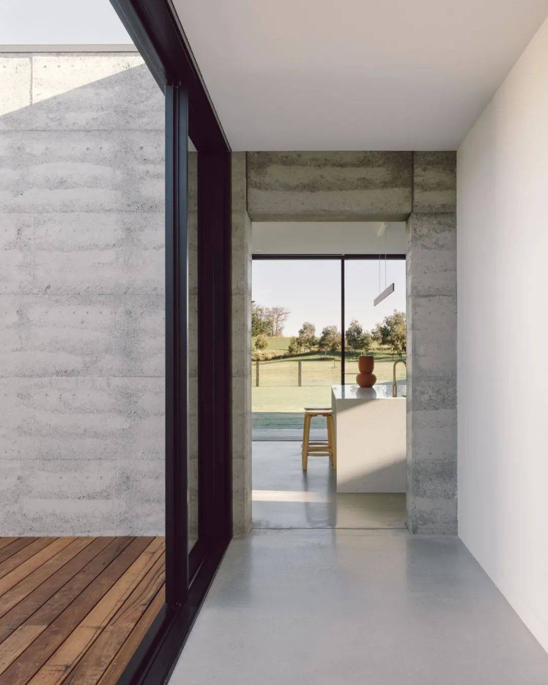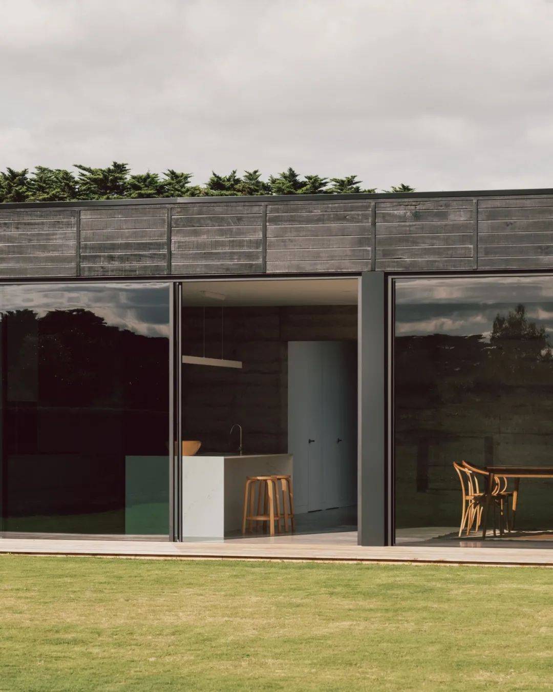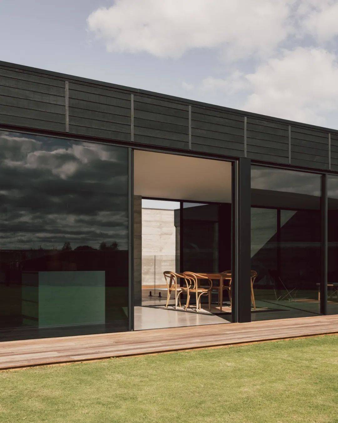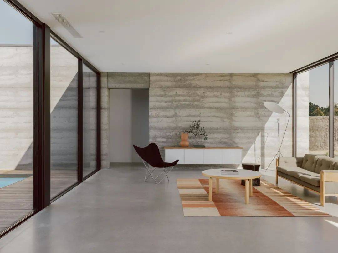 與深色、整體的外觀形成鮮明對比的是,內部采用了600毫米厚的夯土墻和木材裝飾板,營造溫暖色調。中央庭院和游泳池遠離自然環境,住宅的核心是鼓勵玩耍和娛樂。