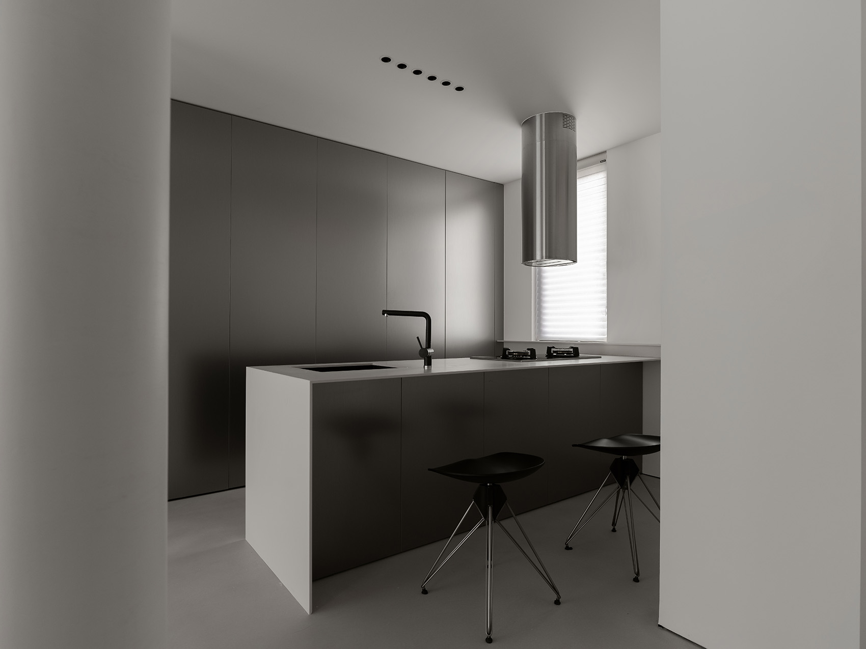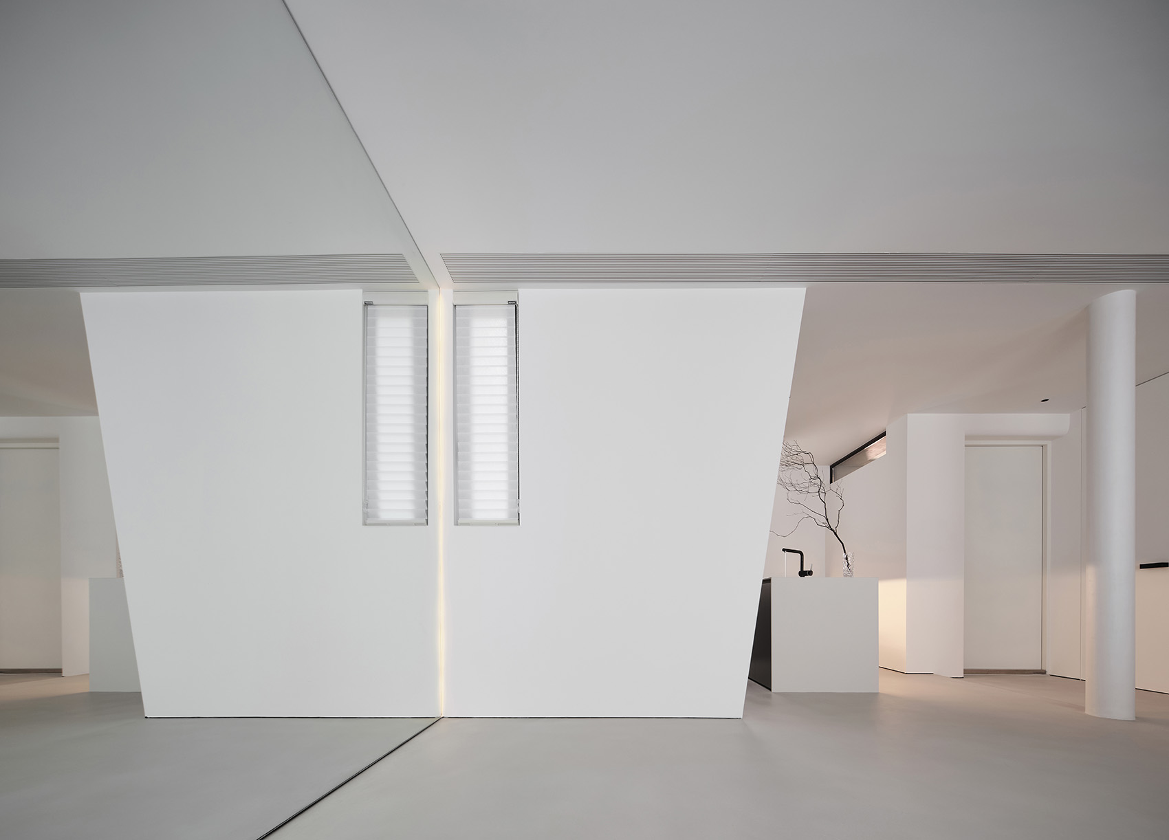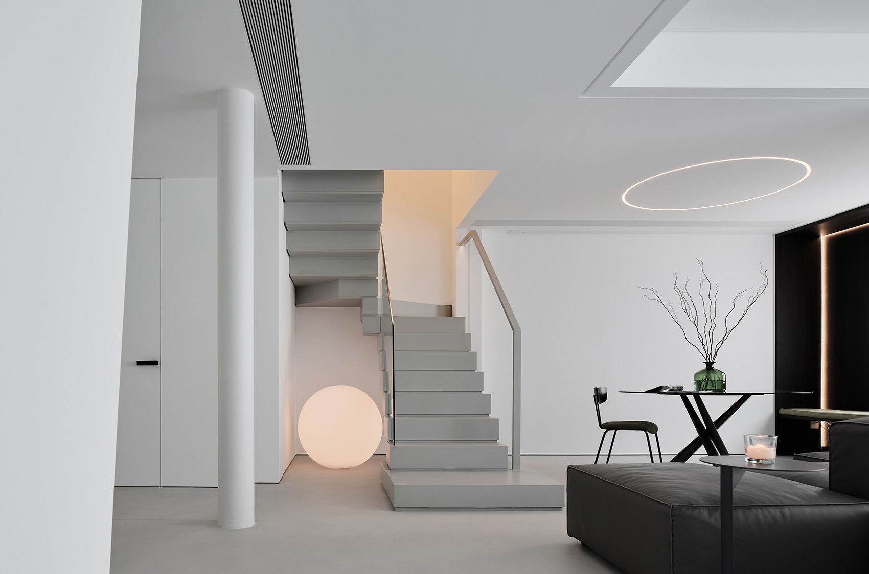 由外向內的設計的同時由內向外的設計,制造必要的張力會讓入口更具魅力。人們平常活動的平面空間之外,還有上、下部分空間所產生的拉力存在于住宅的縱向兩極,而這種拉力正是靠樓梯牽引,也正是上和下的空間變化讓我們的想象力有所去處。上樓或下樓時,以此帶來的視角的改變,離開常規的水平面。