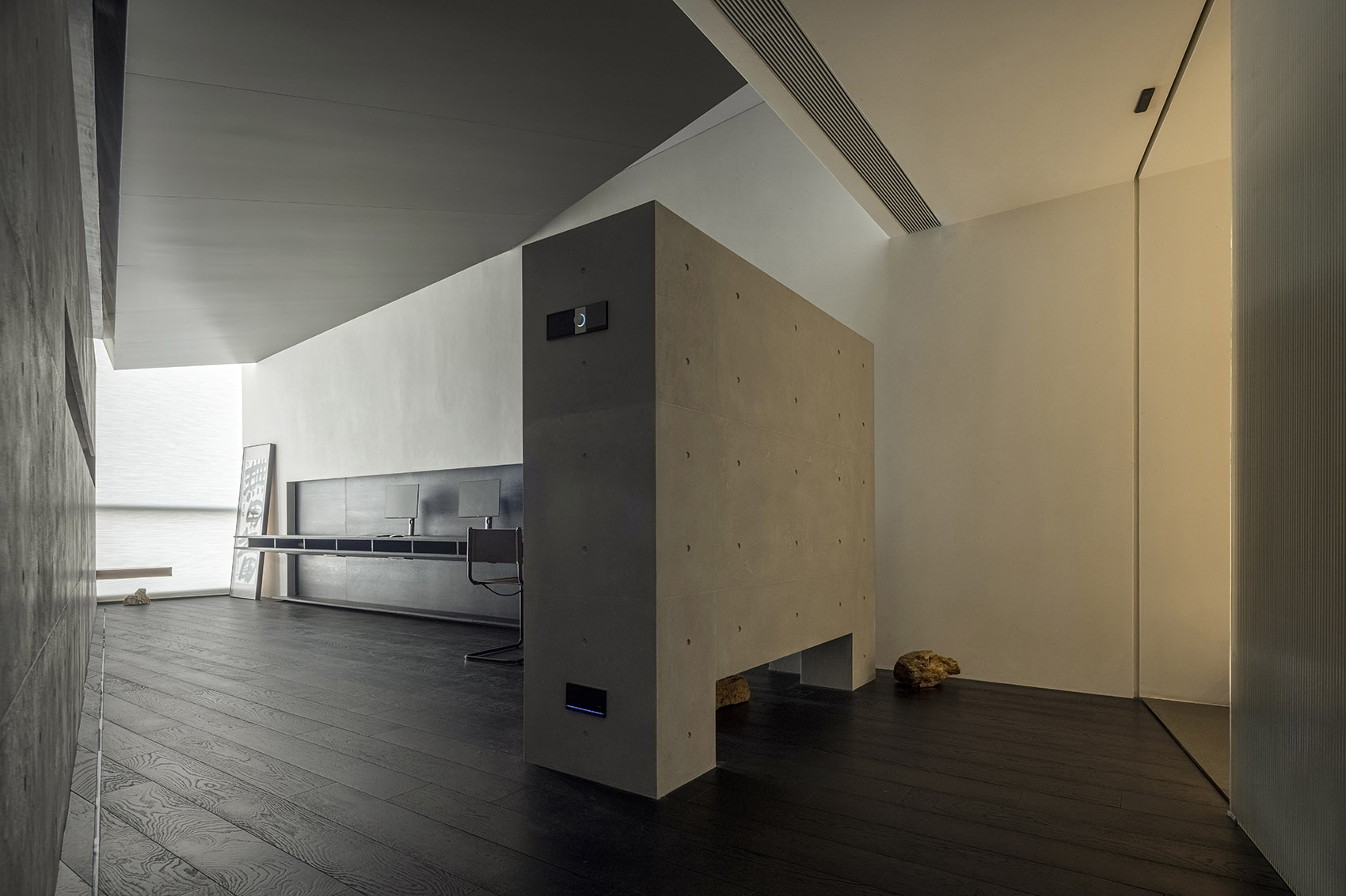 三道墻體的置入形成不同的功能空間,分割空間的同時保持空間與空間之間流動性。這樣空間是自由的,墻體也是自由的,空間不僅于單一的功能載體,也是精神和能量的寄托。