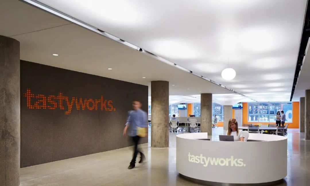 網(wǎng)絡(luò)證券公司Tastyworks的芝加哥辦公室,是一棟冷庫改建的辦公大樓。接待區(qū)的Logo 墻面,設(shè)計選用了Filzfelt棕色的200和橙色的151色號羊毛毛氈,雙層疊加后在表層飾面精確鏤空,將Tasty Works公司的logo通過底層明亮的橙色毛氈透出,克制而不張揚。